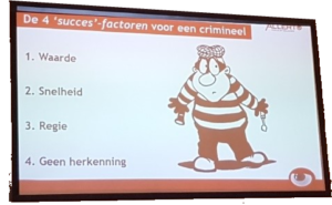 De dag werd afgesloten met een hapje en drankje, maar voordat iedereen hiernaartoe kon was er een spectaculaire afsluiting. De organisatie had een ‘dief’ ingehuurd en deze had alles op video vastgelegd en deze beelden werden gedeeld met iedereen. Dat was schrikken, want de buit was flink. Meerdere laptops, mobiele telefoons, autosleutels en portemonnees. Zo werden wij met de neus op de feiten gedrukt dat we nonchalanter waren, omdat er deze dag veel politie aanwezig was. Dat was echt schrikken voor iedereen en ook voor de politie .